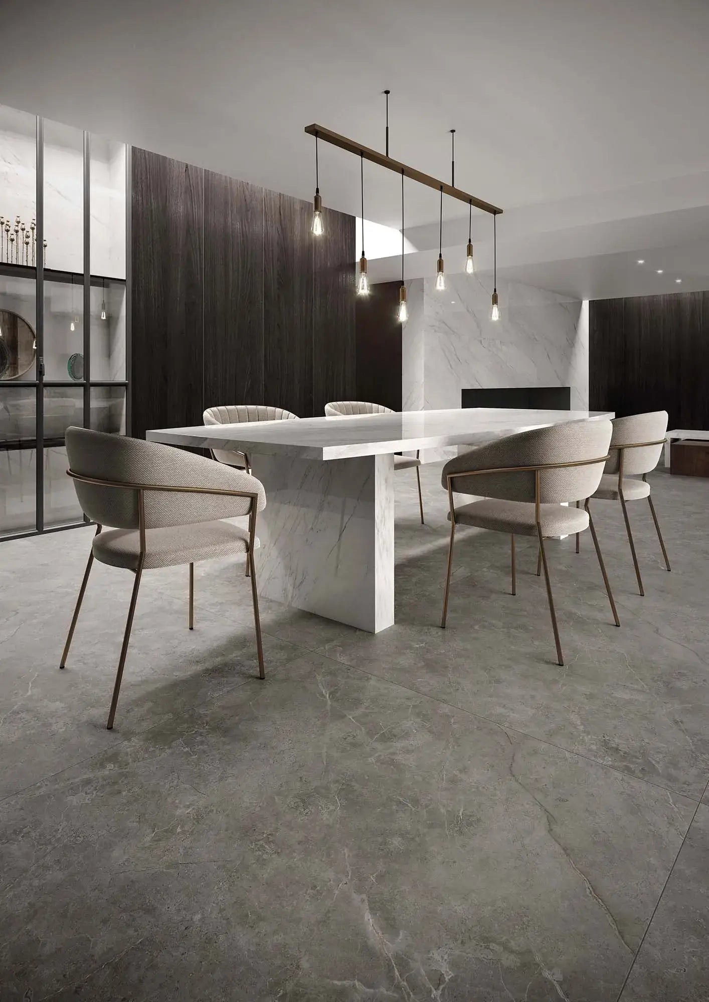 The distinguished Italian grey marble transformed in a design that mixes stability and firmness through its pronounced greige veins. The diversity of fossil details and stone shades gives great depth and character to this exquisite surface that incites to be touched.